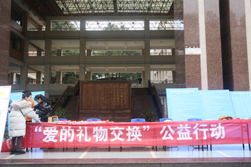 本网讯(学生记者 宁戈菲 李尚龙)12月21日中午,为了更好地向泸西县松柏潭小学的孩子们传递爱心与温暖,让他们能度过一个温馨而美好的元旦,“中国好人”、“中国大学生自强之星”必赢nn699net官网殷沙曼携手麦田计划志愿者,在总理楼一楼举行名为“爱的礼物交换”的公益行动。