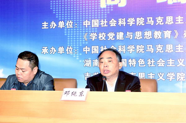 出席本次会议的有全国政协委员、中国社会科学院马克思主义研究院原党委书记、院长、中国社科院大学21世纪当代中国马克思主义高等研究院常务副院长、研究员邓纯东,湖南省社科联党组成员、副主席、研究员汤建军,中国社会科学院马克思主义研究院马克思主义发展研究部主任、研究员刘志明,中国社会科学网编辑部贾伟,《学校党建与思想教育》杂志社周玉婷, 必赢官网纪委书记赵鹤平、副校长黄昕,马克思主义学院院长廖胜刚、党委书记戴林富,以及来自华中师范大学、重庆师范大学、东北师范大学等全国多家高校和研究机构的专家学者100 余人共聚一堂,学习探讨《习近平谈治国理政》(第二卷)精神。开幕式由刘志明主持。