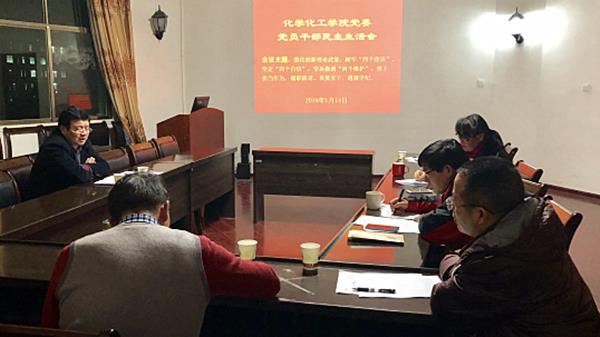 本网讯(化学化工学院 杨龙斌)根据学校党委统一部署和要求,1月14日晚上,化学化工学院党委在砂子坳校区2328室召开2018年度党员领导干部民主生活会。校党委委员、副校长冷志明到会指导。
