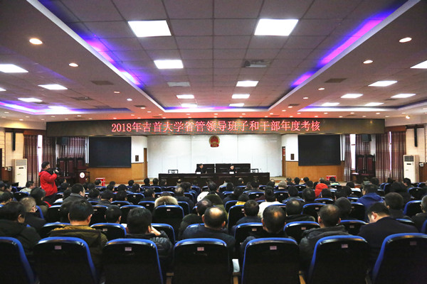 本网讯(孙立青)1月15日上午,省管领导班子和干部年度考核在吉首校区模拟法庭举行。省委组织部干部四处处长曹四成、副处长赵培军、副处长万芳、副调研员郭立业、副调研员刘立光和省教育工委组织部主任科员尹显丕出席会议。在校全体校领导、中层干部、基层党员干部和教师代表参加会议。会议由校党委书记、校长白晋湘主持。