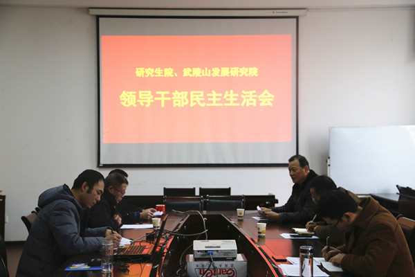 本网讯(见闻)1月22日上午,根据校党委的统一部署和要求,研究生院、武陵山区发展研究院领导班子在研究生院会议室召开2018年度党员领导干部民主生活会。校党委书记、校长白晋湘同志到会指导。研究生院院长佘佐辰、副院长曹福明,武陵山区发展研究院院长张登巧、副院长陈功锡参加会议。研究生院党支部书记肖宪平列席会议。