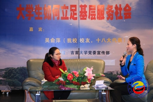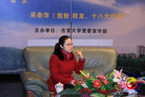 作为刚刚参加完党的十八大代表,吴俞萍首先和大家一起分享了参加十八大的所见所闻所感所悟。吴俞萍详细介绍了十八大的盛况,她说,党代会严谨、严密、严肃而不乏温馨,为代表们投好神圣的一票创造了良好的环境。作为基层、80后、女性党代表,她重点关注了十八大报告中涉及到的少数民族贫困地区的扶贫政策、中青年人才选拔制度、基层党员培养机制、区域性经济发展等问题。她还与同学们分享了自己毕业后考上公务员、下基层做团干及党务工作成长经历。回忆自己在吉大学习的点点滴滴,吴俞萍对母校的培养表示由衷的感激,认为在吉大得到的锻炼尤其是当团干部的经历,为她以后从事基层公务员工作奠定了良好的基础,是人生中一大宝贵财富。