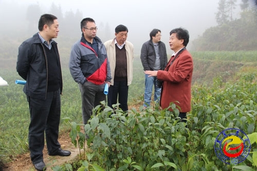 图为 韩敬友(左二)考察老爹公司寨阳杜仲天然橡胶繁育基地 翁凯摄