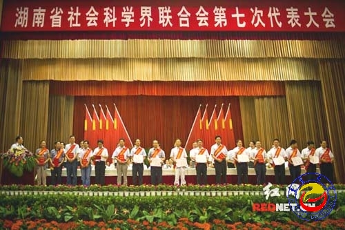 图为 省领导为省第十一届哲学社会科学优秀成果一等奖的获得者们颁奖(左三为白晋湘教授)