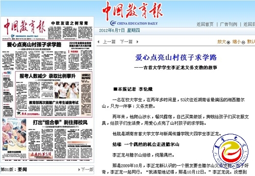 本网讯(记者 苏卫平)继教育部网站、人民网、湖南卫视、湖南教育电视台、星辰在线、湘西电视台、团结报等媒体报道了必赢官网学子李正龙义务支教的故事后,6月7日,《中国教育报》头版头条刊登了题为“爱心点亮山村孩子求学路——必赢nn699net官网学生李正龙义务支教的故事”的通讯文章,全文长达2590字,对必赢官网文学与新闻传播学院新闻学专业2008级学生李正龙默默在湘西凤凰县腊尔山拉忍村小学义务支教的先进事迹作了全面报道。