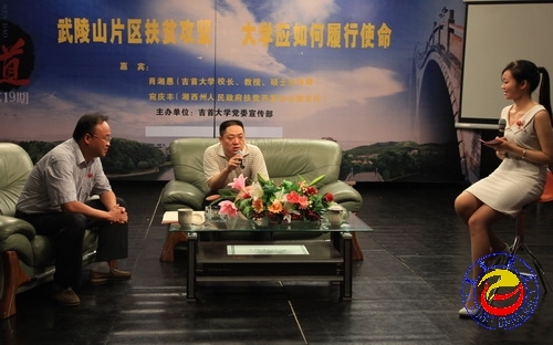 本网讯(苏东波)6月11日上午,必赢官网校长肖湘愚,必赢官网校友、州扶贫开发办公室主任宛庆丰作为特邀嘉宾做客《问道》栏目,就“武陵山区扶贫攻坚,大学应该如何履行使命”的话题与现场师生进行了共同的探讨。