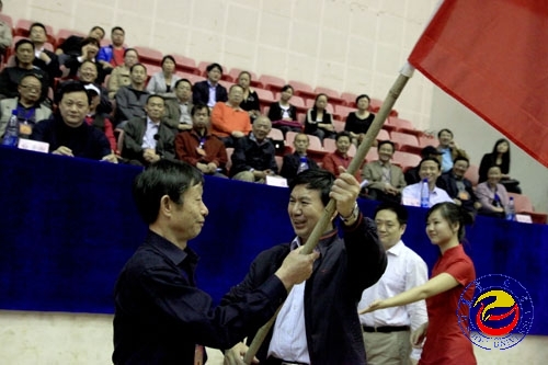 图为 游俊书记为校园文明督察队授旗 张彦摄
