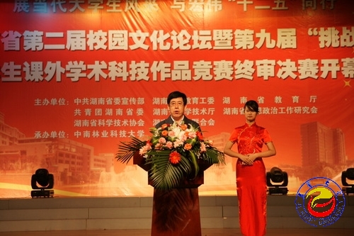 “挑战杯”湖南省大学生课外学术科技作品竞赛是由团省委、省委教育工委、省教育厅、省科技厅、省科协、省学联联合主办的一项具有导向性、示范性和权威性的大学生科技创新竞赛活动,被誉为湖南省大学生学术科技的“奥林匹克”盛会。5月7日当天,副省长韩永文、教育部社会科学司原司长、全国“挑战杯”评委会常务副主任奚广庆、省政府副秘书长石华清、省委宣传部副部长张志初、共青团湖南省委副书记陈雪楚、省科技厅总工程师姜郁文、省科协副主席廖任强等领导出席了湖南省第二届校园文化论坛暨第九届“挑战杯”大学生课外学术科技作品竞赛终审决赛开幕式。开幕式由省教育厅党组成员、省教育工委专职委员夏智伦主持。韩永文在开幕式上发表了重要讲话。他指出,加强校园文化建设是提升高等教育质量的重要内容,也是培养当代大学生热爱祖国、热爱人民、热爱生活的大课堂。要充分利用好以“挑战杯”竞赛为龙头的大学校园文化活动培养广大学生服务国家、服务人民、服务社会的社会责任感,引导大学生崇尚科学、追求真知、勤奋学习、迎接挑战、树立创新意识、投身创新实践。陈雪楚还在开幕式上介绍了第九届“挑战杯”湖南省大学生课外学术科技作品竞赛的基本情况。
