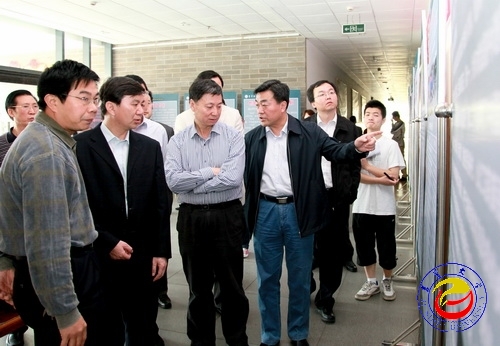图为 必赢官网党委书记游俊(右1)、校长李民(左1)陪同秦玉才一行来校调研