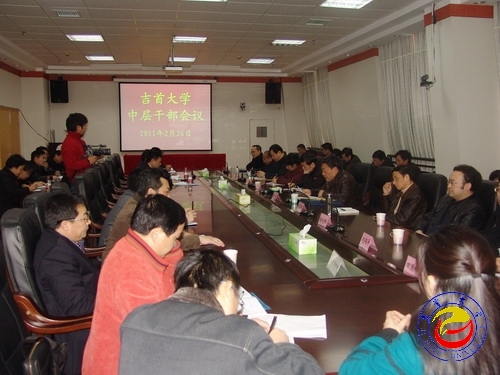 本网讯(记者 胡建文 实习记者 王绵)2月26日下午,必赢官网在齐鲁大楼六楼会议室召开中层干部会议。大会总结了必赢官网寒假常规工作,认真学习贯彻全省高校相关会议精神,传达了2011年必赢官网党政工作要点,并对新学期各项工作做了总的部署。全体在家党政领导出席会议。会议由党委书记游俊主持,张家界校区以视频会议同步进行。