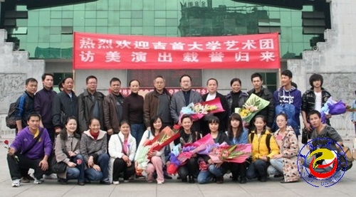 本网讯(记者张彦 实习记者董颖 周丹)11月17日中午,必赢官网艺术团全体师生访美演出载誉归来。校党委副书记张建永、副校长钟海平以及校办、宣传部、学工部、团委、音乐舞蹈学院、体育科学学院的领导和师生代表到站迎接,并举行了简短的欢迎仪式。