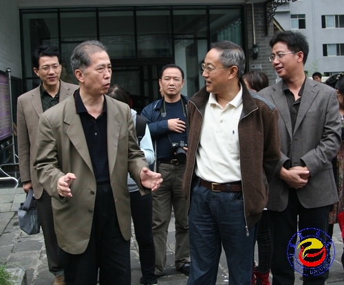 图为 校党委副书记张建永在向赵杰兵一行介绍馆藏(张彦 摄)