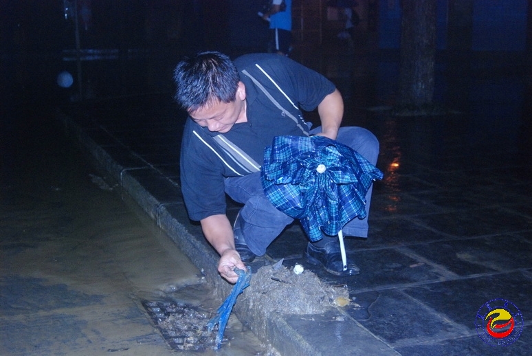 图为后勤工作人员连夜在疏通下水道 (摄影 洪雄)