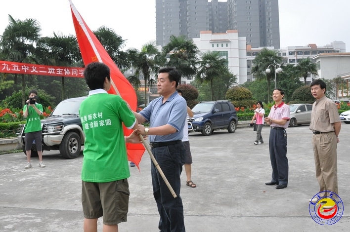 图为校长李民为“三下乡”服务团授旗 (摄影 洪雄)