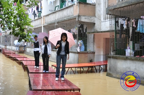 6月7日夜晚,一场暴雨来袭,加上几天来持续不断的雨水,砂子坳校区启明广场已无法通行、学生宿舍3、4、5栋学生已无法出入,校园内最深水位已超过1米。