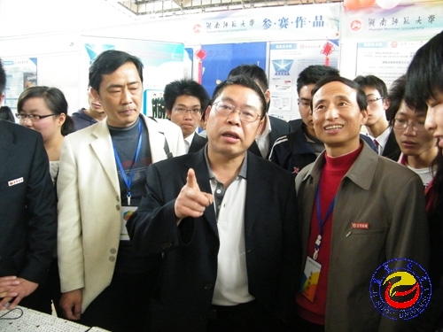 李克纲副校长(前排中)和校团委书记周华忠(前排右)对参展学生进行指导
