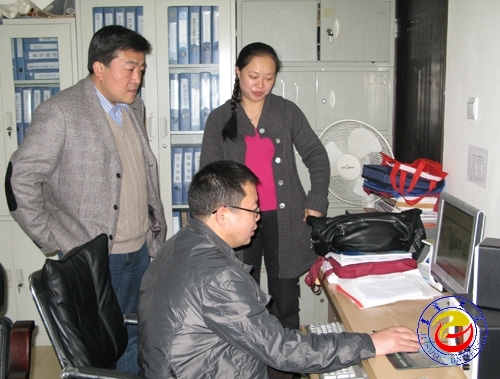 图为李民校长在人事处检查OA系统的使用情况 苏卫平摄