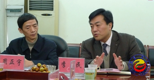 校长李民(右)在签约仪式上讲话 白薛摄影