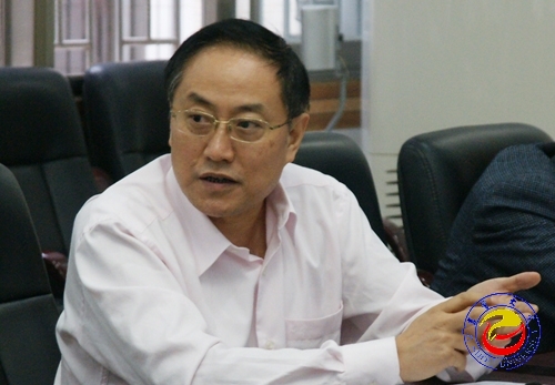 图为党委副书记刘靖在听取机关负责人工作汇报 海奇摄