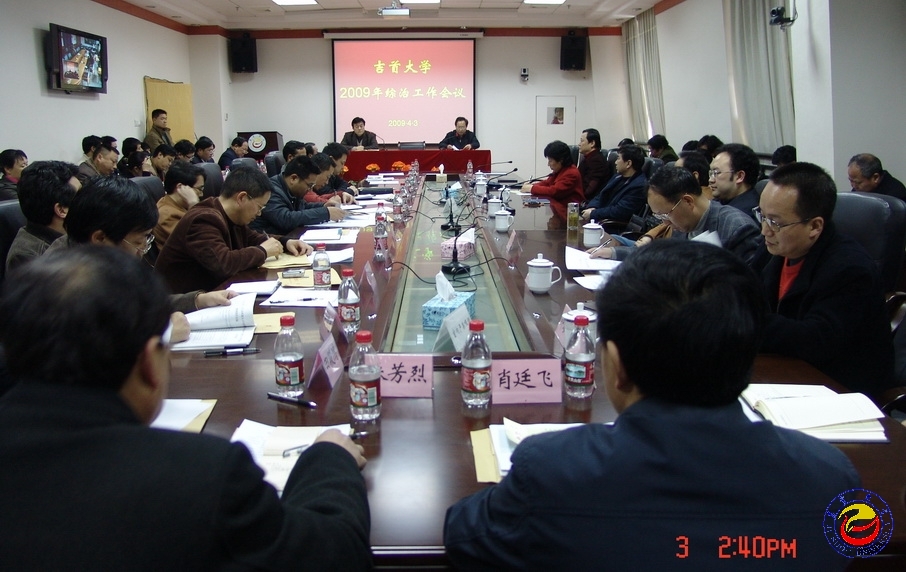 本网讯(记者 龚妮峰)4月3日下午,在齐鲁大楼六楼会议室,学校召开了2009年维稳综治工作、财务工作会议和深入学习实践科学发展观工作布置会,张家界校区以视频同步进行。在家的所有学校党政领导出席,各部门、各学院的党政领导参加。会议由校长李民主持。会议内容主要有:2008年维稳综治工作总结表彰,2009年财务预算说明,各单位签订责任书。