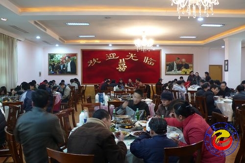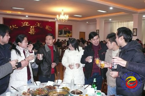 本网讯(记者吴洪波)1月24日中午,学校在科技交流中心二楼餐厅举行了2008年春节团拜会,校党委书记游俊、副校长李克纲与100余名春节期间值班的教职员工及寒假留校的学生共进团年宴。 团拜会上, 游俊作了新春祝辞,向大家致以节日的问候和祝福。 随后大家举杯共庆新春佳节。游俊、李克纲还依次向各桌的师生敬酒,整个团拜会气氛热烈欢快。校办、学工部、保卫处、产业处及部分学院的负责人参加了团拜会。