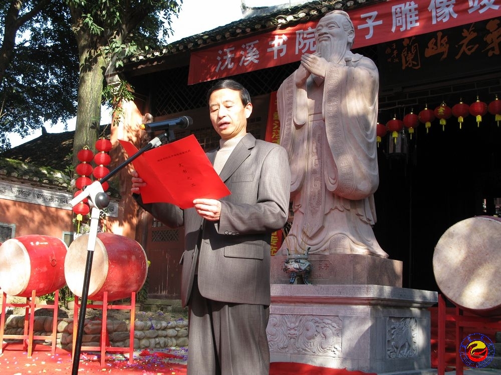 李克纲、秦平、龙京沙、贾维剑为孔子雕像隆重揭幕之后,贾维剑代表全院师生为先师孔子敬香、祭酒。全体人员双手合十,向孔子雕像三叩首。